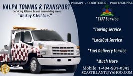 Valpatowing and Transport is a locally owned company. No matter if you are looking for quality towing service, great Roadside Assistance or you just need a tire changed. Valpa towing & Transport has been providing quality service to the Atlanta and Atlanta metro area since day one. We are available 24/7 days a week